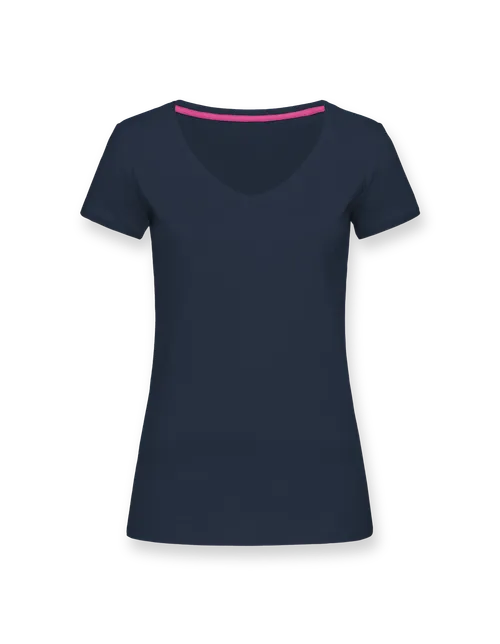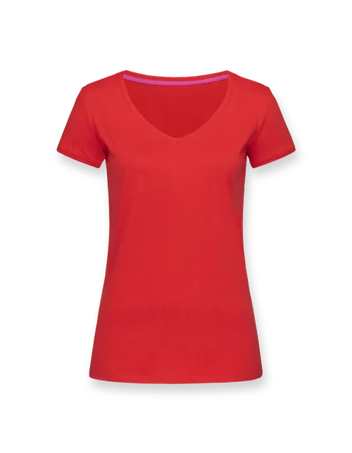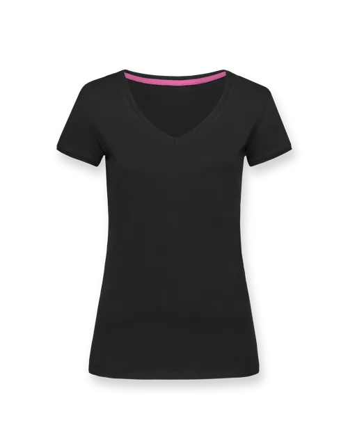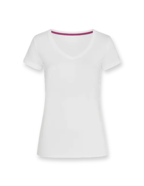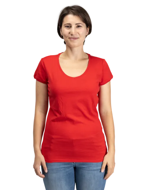 Le T-shirt femme à col V met la silhouhette féminine parfaitement en valeur. Sa coupe légèrement cintrée permet de l’associer à des tenues sportives ou plus classiques. Le T-shirt est imprimable sur la poitrine et dans le dos.
